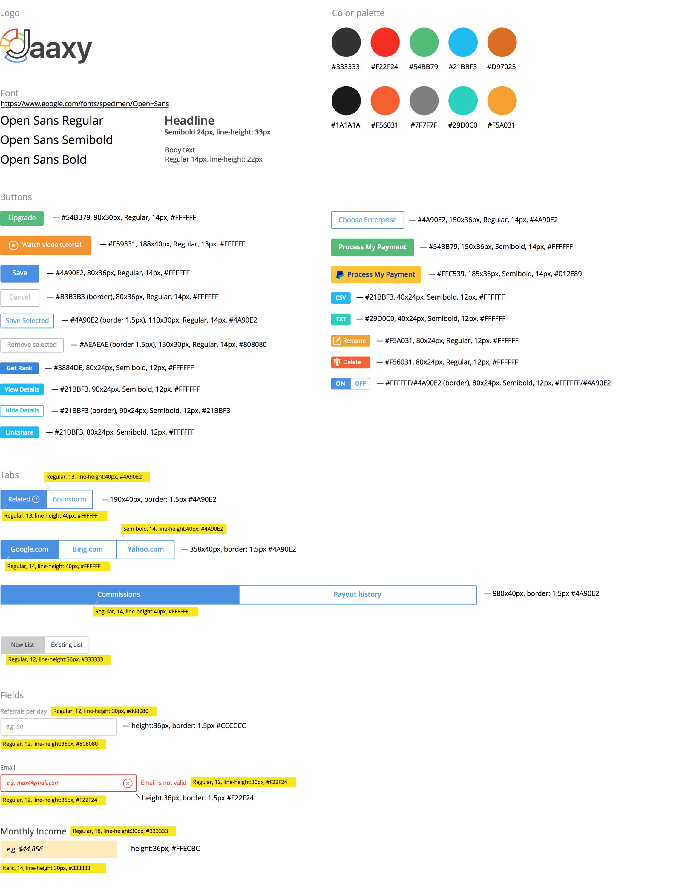 After the design work was done we designed a style guide that gives all the necessary info about the UI we designed. So the development team on the client's side could work on the implementation of the UI without a hesitation.