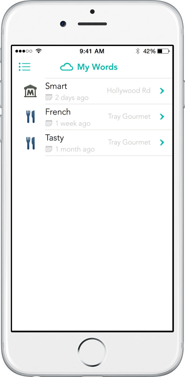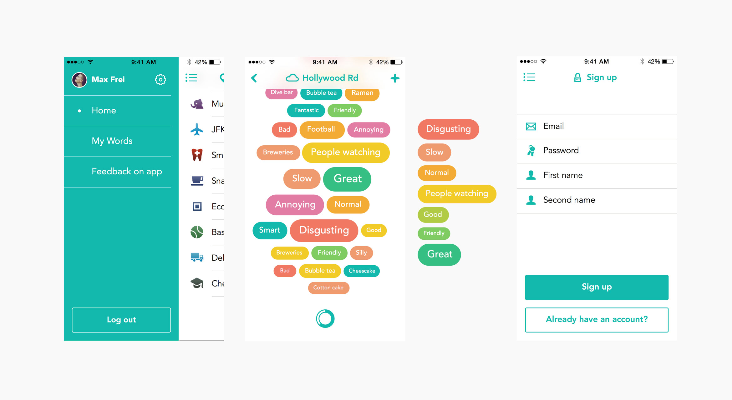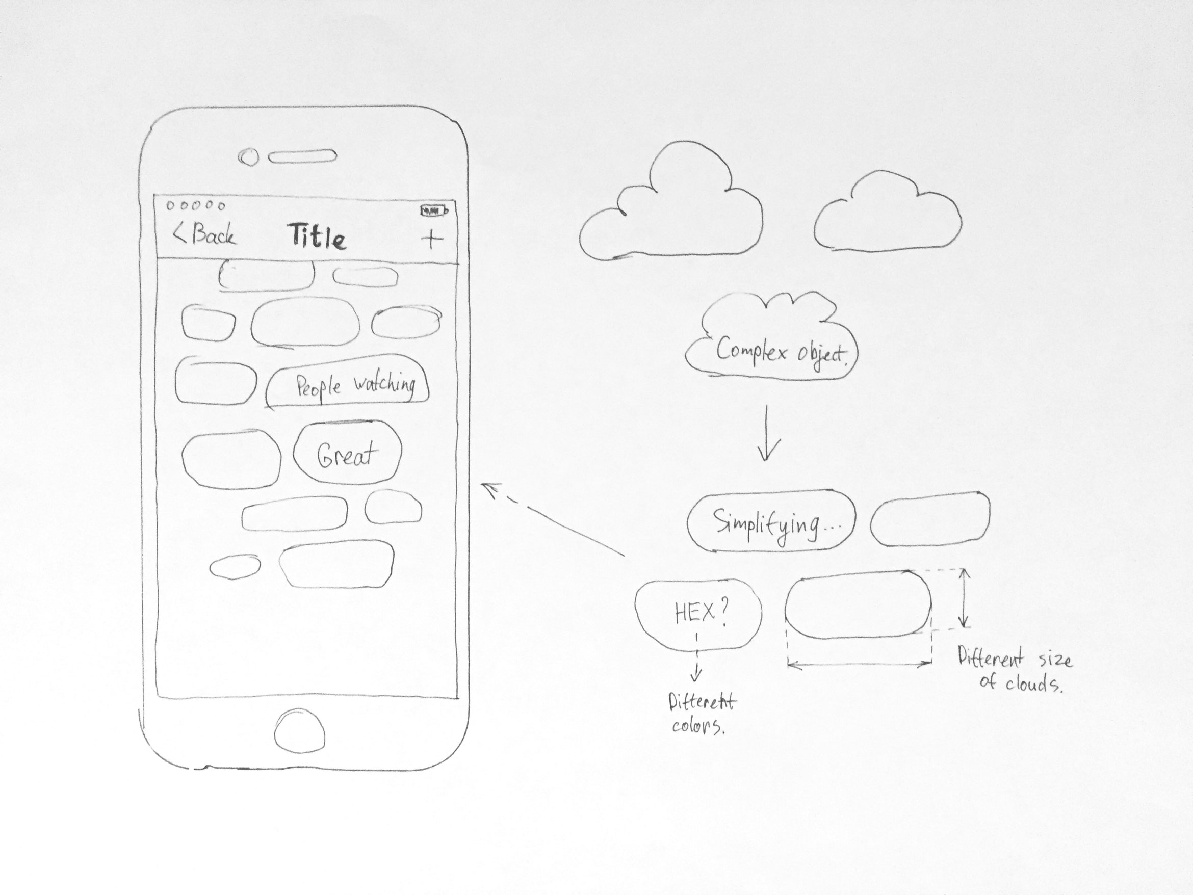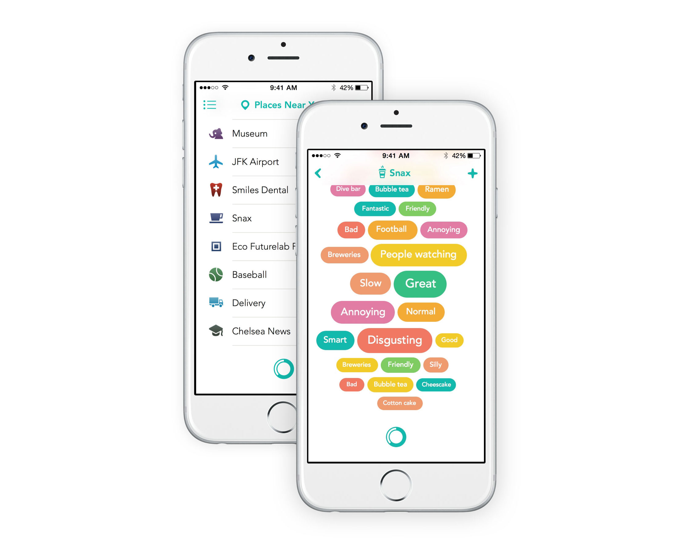 The interface of the app shows places near by. People can see a list of places and by tap discover different opinions of people on this place. Basically, you can have a solid visual picture about the place that built with clouds of different size and color.