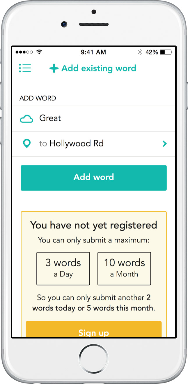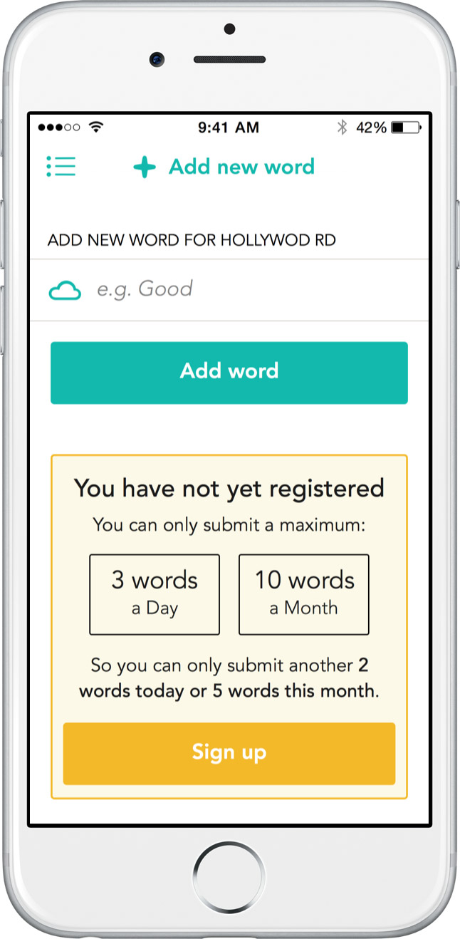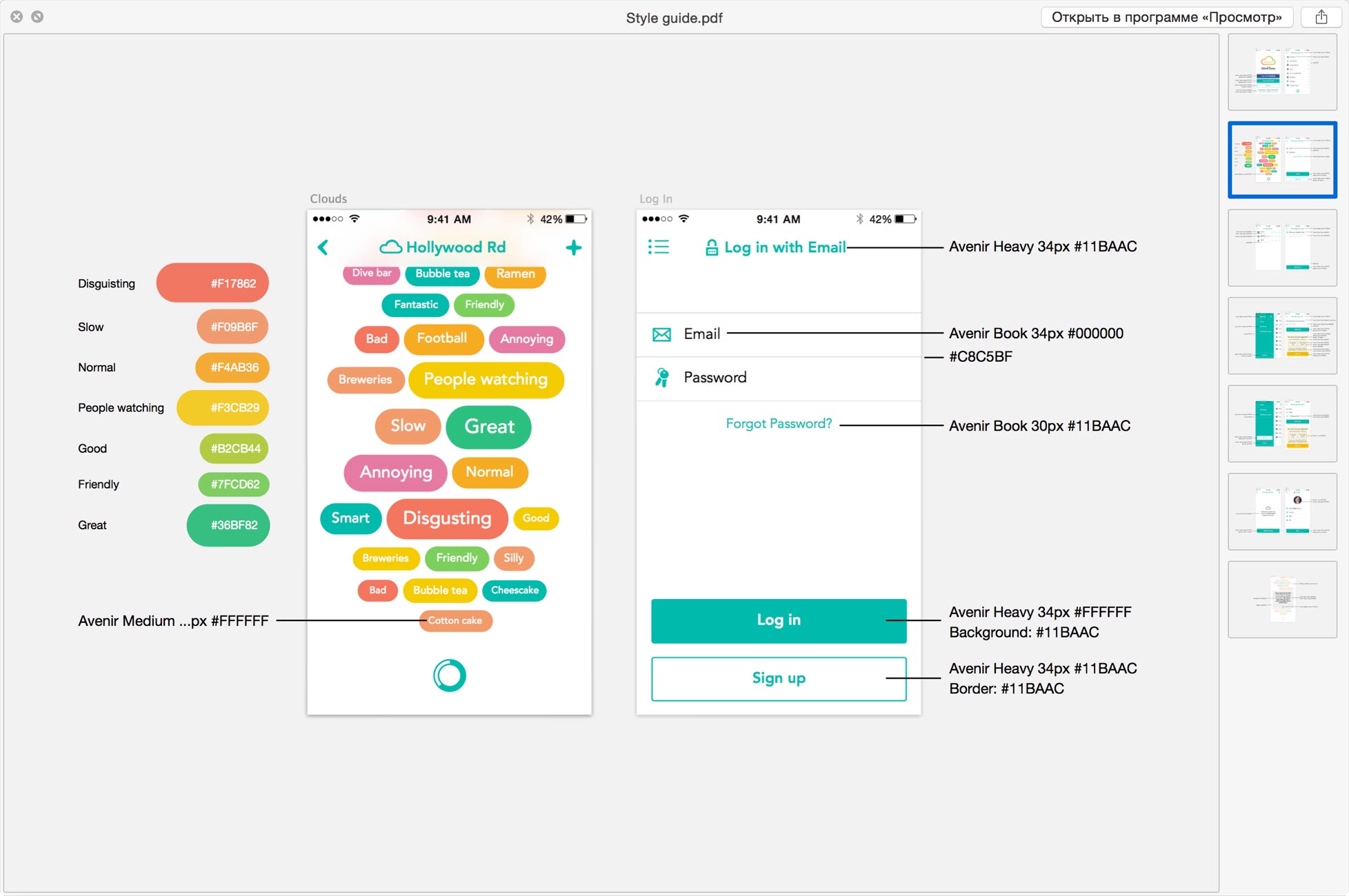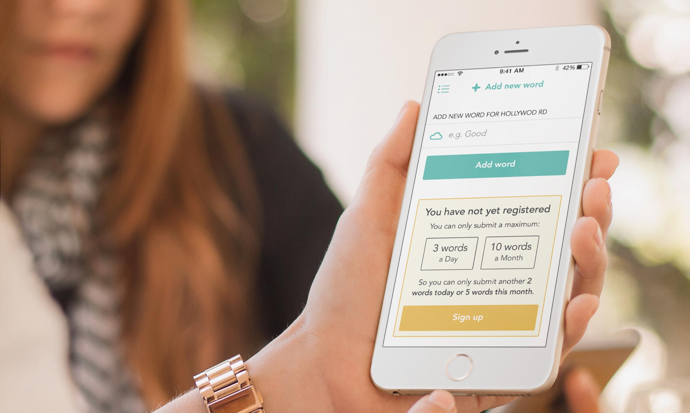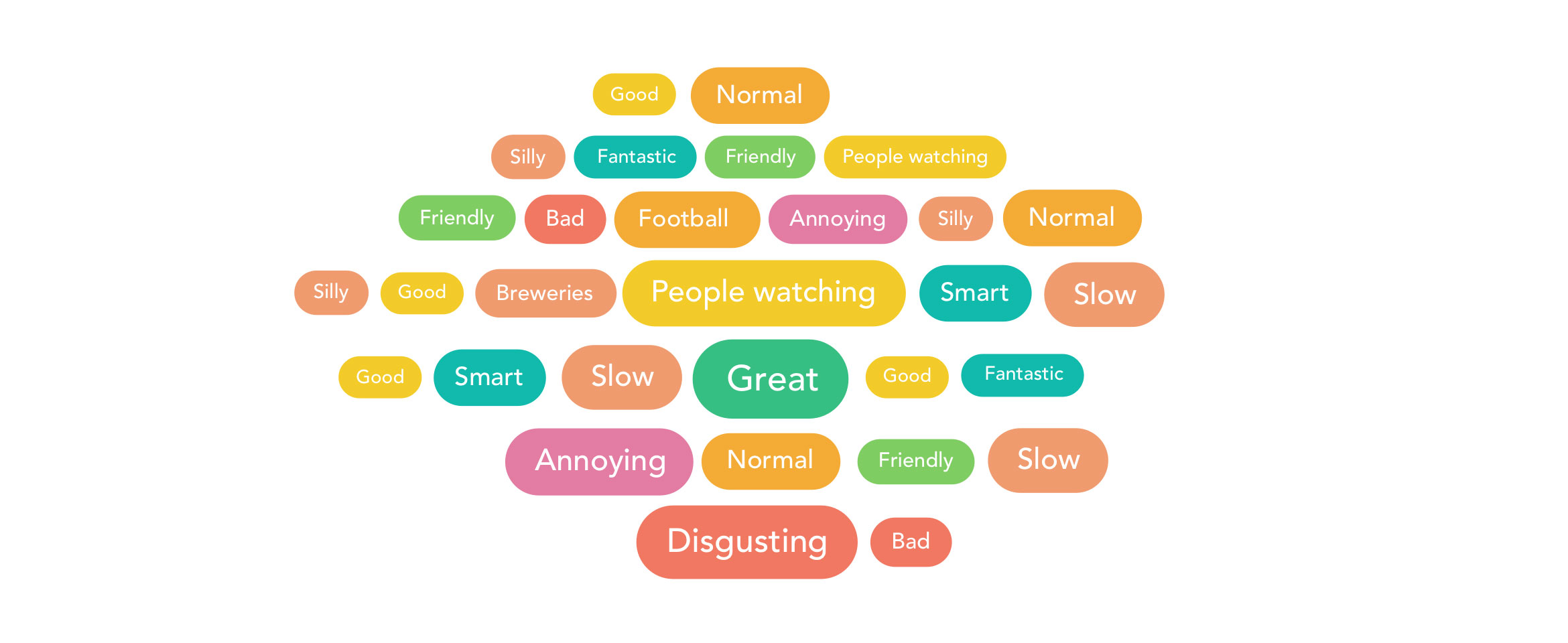The interface of the app shows places near by. People can see a list of places and by tap discover different opinions of people on this place. Basically, you can have a solid visual picture about the place that built with clouds of different size and color.